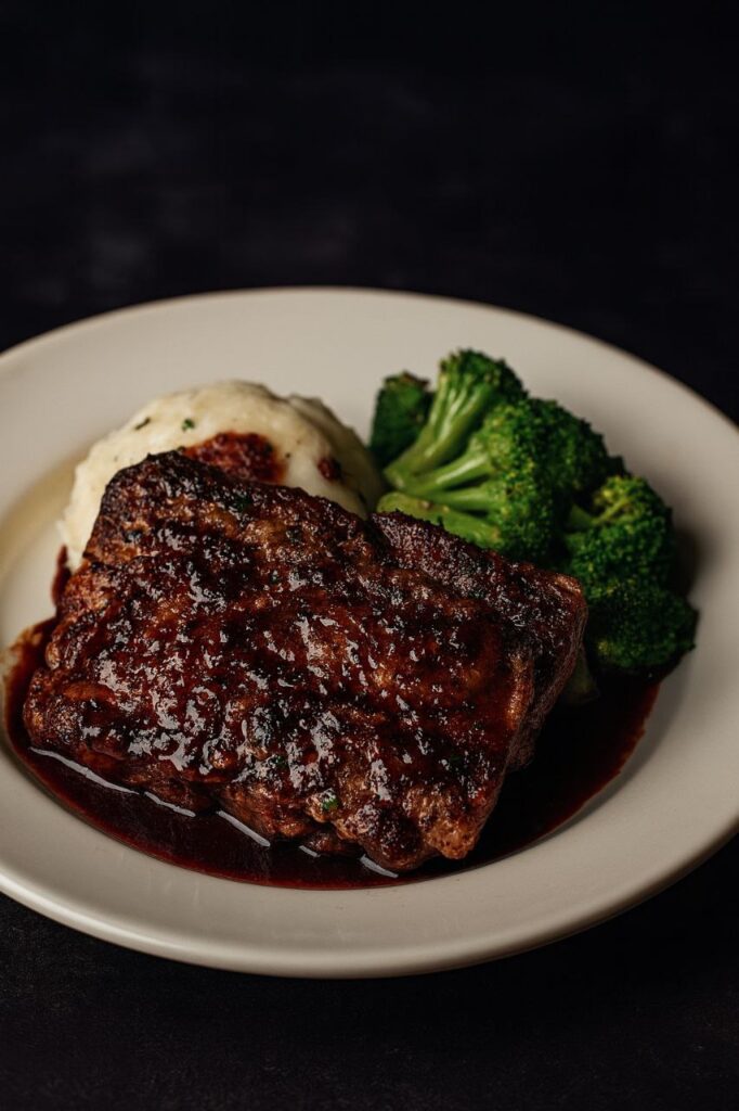 Served with velvety mashed potatoes and carefully selected fresh vegetables, this dish embodies comfort redefined through culinary craftsmanship.